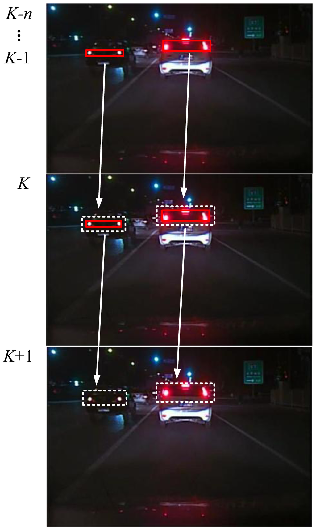 Another aspect is adding a tracking algorithm to taillights detection to use the inter-frame information. A classic work is proposed by O'Malley et al. [7,8], who used the Kalman filtering method to track the location of the taillights by the previous location. Then, when the taillights detection is missing, the estimated location is used to compensate for the unavailable detection. Following O'Malley et al. [7,8], many variants and extensions have been reported for taillights detection [5,9,10]. Similar ideas can also be found in [11,12], where the templates of specific rules for taillights detection are tracked. This tracking method can be further categorized into two types: tracking the pair of taillights [7,8,13,14] and tracking the taillight spots [6,9,15]. These tracking methods can effectively reduce vehicle detection false negative rates, but it is difficult to reduce the false positive detection rate. Moreover, the thresholds for extracting the taillight spots are fixed for all frames.