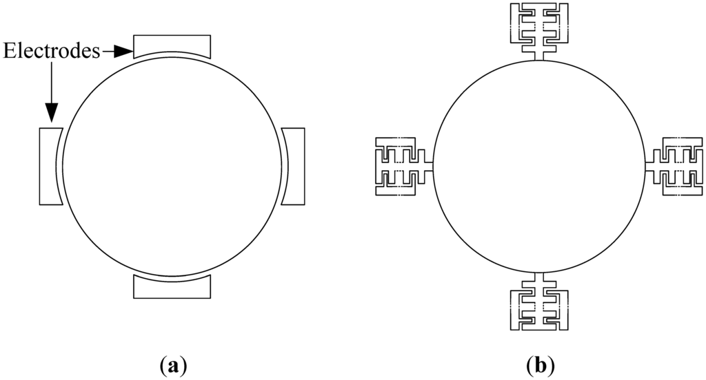 Bulk mode disk devices are composed of a main central disk structure (circular or polygonal), which vibrates in a higher order bulk mode. Outer electrodes are used for electrostatic actuation of the structure in the drive mode. When the device is subject to rotation, the Coriolis force excites a different mode than the drive mode, the sense mode. The resulting vibration is then detected through the sense electrodes, enabling the gyroscope operation. Traditionally, to drive and sense the disk vibration, electrodes are directly placed at vibrational areas around the disk, as shown in Figure 1a.