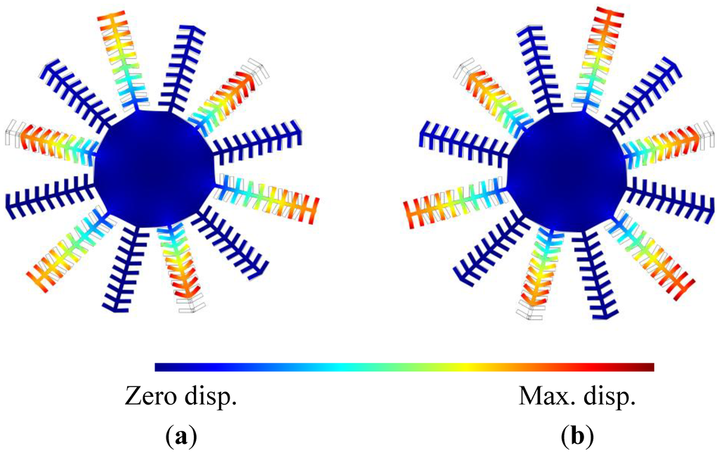 Eigen frequency simulations were performed for the entire disk and comb structure. The resonance frequencies of the drive and sense modes were found to be 1.499271 MHz and 1.499543 MHz, respectively. The mode shapes of the drive and sense modes are shown in Figure 10. It is clear that the combs vibrate constructively with the disk. This was confirmed by performing a frequency analysis for the structures and making sure that the displacement of the disk vertices scale with the number of fingers subject to the face forces.