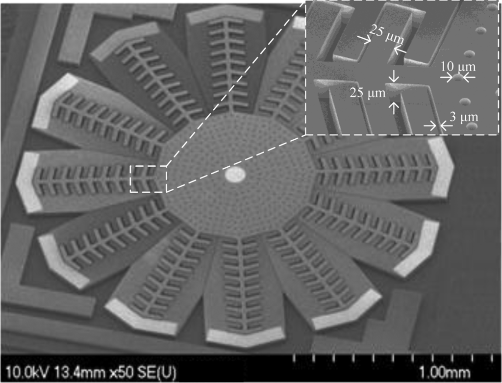Devices were fabricated in the SOIMUMPs technology from MEMSCAP. An SEM micrograph of a fabricated device is shown in Figure 11.