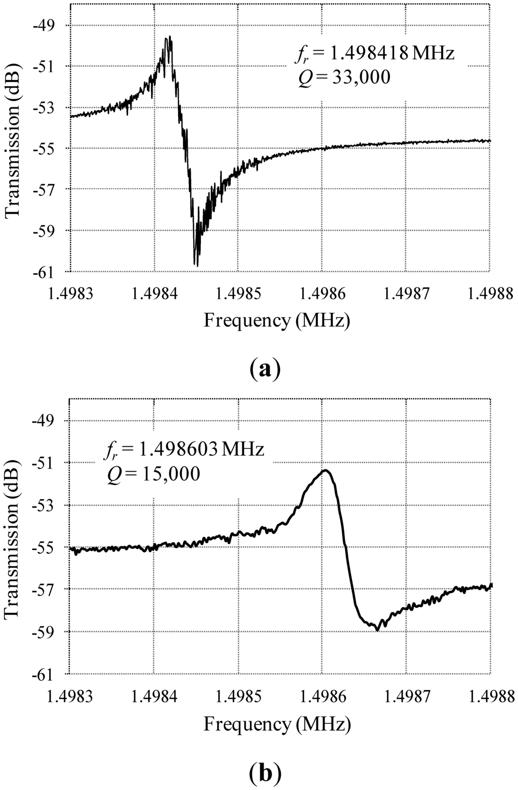 The resonance characteristics of the drive and sense modes were measured under a vacuum level ∼10 mTorr. The prototypes were found to resonate in the drive mode with a center frequency of 1.498418 MHz, and a quality factor of 33,000, and in the sense mode with a center frequency of 1.498603 MHz, and a quality factor of 15,000, as shown in Figure 12. These resonance frequencies are consistent with the simulated results. The difference between the quality factors of the drive and sense modes may be due to the anisotropic elastic properties of the (100) single crystalline silicon structural layer provided by the fabrication technology, as detailed in [17].