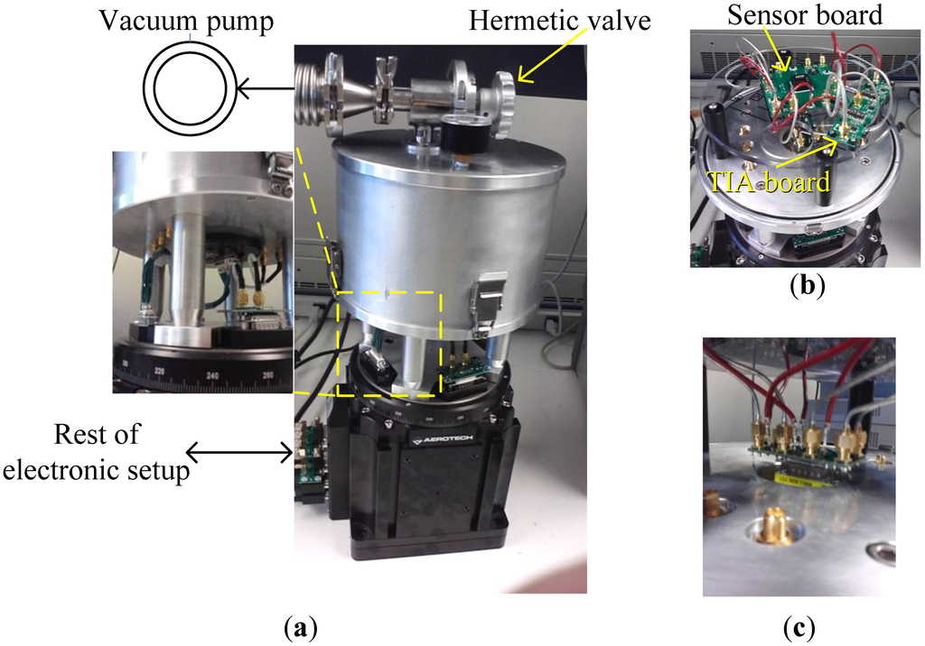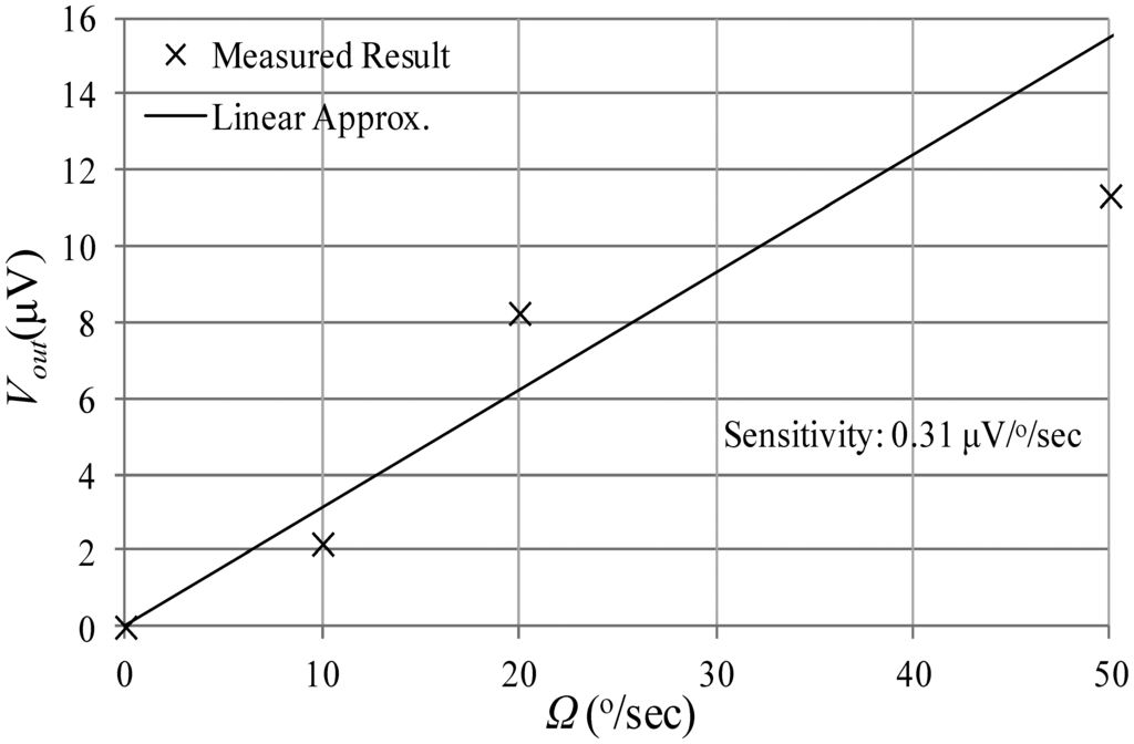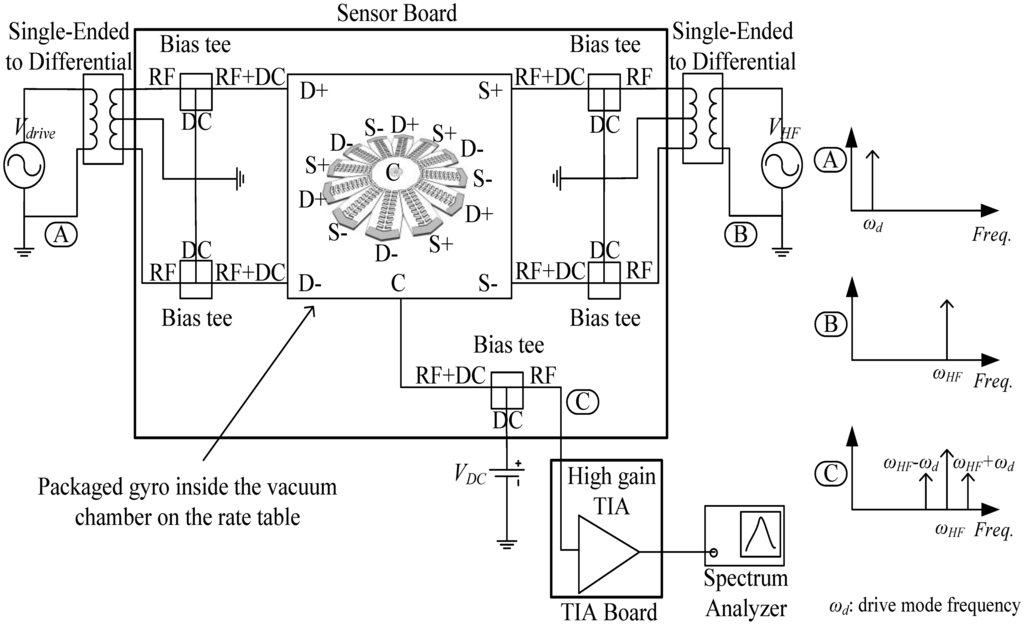 The angular rate response of a prototype gyro was measured at a ∼10 mTorr vacuum level using discrete electronics, a rate table, and a vacuum chamber, fixed on top of the rate table. A schematic of the test setup is shown in Figure 13. The vacuum chamber was designed and custom machined in-house. A hermetic valve was added to it, in order to maintain the vacuum level while rotation after the valve is closed and the pump is disconnected, as shown in Figure 14. Bias tees are used to apply the DC voltages required by the drive and sense electrodes. They are built using discrete components on the sensor board. Furthermore, a high gain trans-impedance amplifier board was built using the AD8015 transimpedance amplifier (TIA) chip from Analog Devices, in order to amplify the gyro's output signal current. Figure 15 shows a photograph of the printed circuit boards (PCBs) that include the gyro and TIA, where the electrodes of the gyro and the input and output of the TIA are each connected to an SMA connector to be interfaced within the test setup. The high frequency signal (VHF) is used to modulate the output signal of the gyroscope to a higher frequency, in order to separate it from any feed-through from the drive signal utilizing a mixing configuration similar to that in [5,6]. Measurements were limited below 50 °/s angular rate input due to the mechanical limitations of the current test setup. The rate sensitivity was measured to be 0.31 μV/°/sec, corresponding to a capacitance sensitivity of 0.43 aF/°/s/electrode. The resulting measured angular rate response is shown in Figure 16. These measurement results are limited by the parasitics and noise floor of the discrete test setup. Improved performance could be achieved by using an application specific integrated circuit (ASIC) and wire bonding it to the device within the same package to reduce noise and parasitics (e.g., as demonstrated in [18] for a capacitive accelerometer).