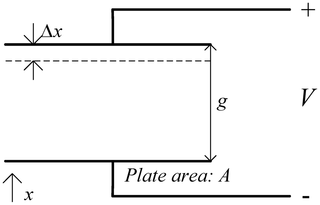The idea proposed here extends the central resonating disk structure by adding parallel plate comb drives with a variable gap configuration to the parts of the disk which exhibit the maximum vibration amplitude in the drive and sensor resonant modes, as shown in simplified form in Figure 1b. This increases the drive strength and enhances the device sensitivity. This sensitivity improvement is due to the increased electrostatic force and capacitance change that result because of the larger electrode surface area. Equations (3) and (4) outline the impact of electrode area on the force and capacitance, in relation to a parallel place capacitor shown in Figure 2 [14]: