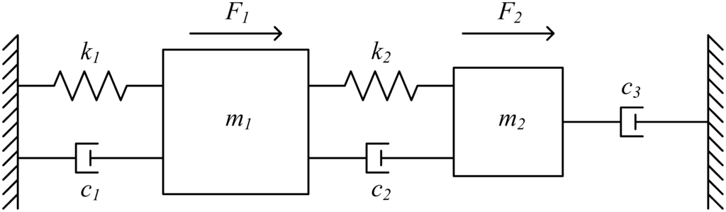 Generally, any resonating structure, including the disk resonator and the comb resonating structure, can be modeled with a mass-spring-damper system as shown in Figure 3. In order to model the combined resonating system, the mass-spring-damper models for both the disk and the comb resonators are combined to give the double mass-spring-damper system shown in Figure 4, which will be used to illustrate the operating principle of the combined disk-comb device. k1 and k2 are the spring constants of the disk (primary structure) and the comb (secondary structure), respectively; m1 and m2 are the masses of the disk and the comb, respectively; and c1, c2, and c3 are the different damping coefficients acting on the system. F1 is the electrostatic force acting on the disk faces directly, and F2 is the total electrostatic force of each comb drive. x1 and x2 are the displacements of the primary and secondary masses, respectively.