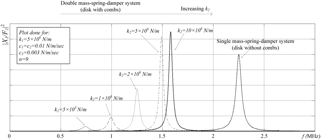 Figure 5 shows the magnitude of this transfer function versus frequency for different values of k2, with all other parameters kept constant, and for the mode utilized in our design, where the two masses exhibit in-phase motion. The transfer function of a single mass-spring-damper system (m1-k1-c1) is also plotted for comparison and is given by Equation (11):