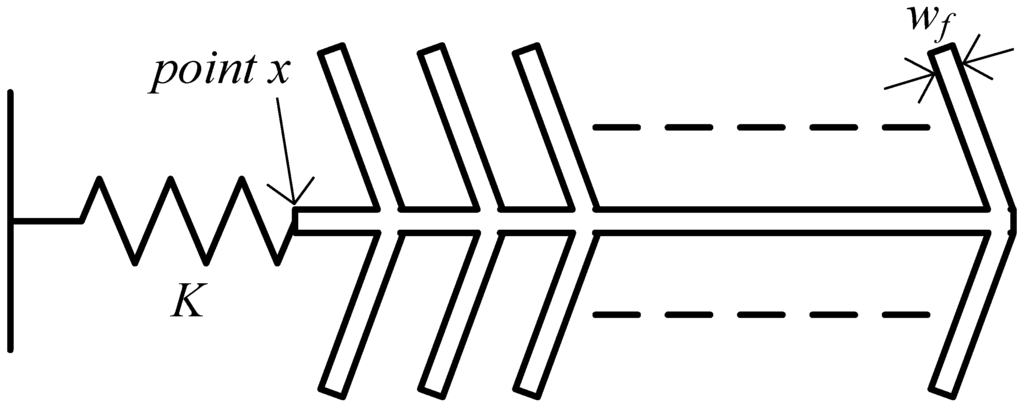 The COMSOL Multiphysics finite element simulation package is used for all simulations. As was previously mentioned, for the device to function properly, the comb fingers should be stiff enough so that the electrostatic force applied to them is coupled to the disk faces, and to ensure that they vibrate constructively with the disk and not in any spurious mode. In order to optimize the width of the comb fingers (wf), the simplified model for one comb drive shown in Figure 8 is used. In this model, the disk is replaced by a spring, with spring constant K acting as the primary spring constant in the model in Figure 4, which was obtained to be ∼106 N/m through stationary simulation, by applying a force to the disk faces and measuring the resulting displacement. Stationary simulation was then performed on the model in Figure 8, and the displacement of the comb end which is connected to the spring (point x) was measured and compared to that of the tips of the fingers. The finger width was then tuned such that these displacements were almost the same, and scaled according to the number of fingers on which the force was applied. Table 1 shows the stationary displacement of point x normalized with respect to the applied force per unit area using Equation (12) for different finger widths: