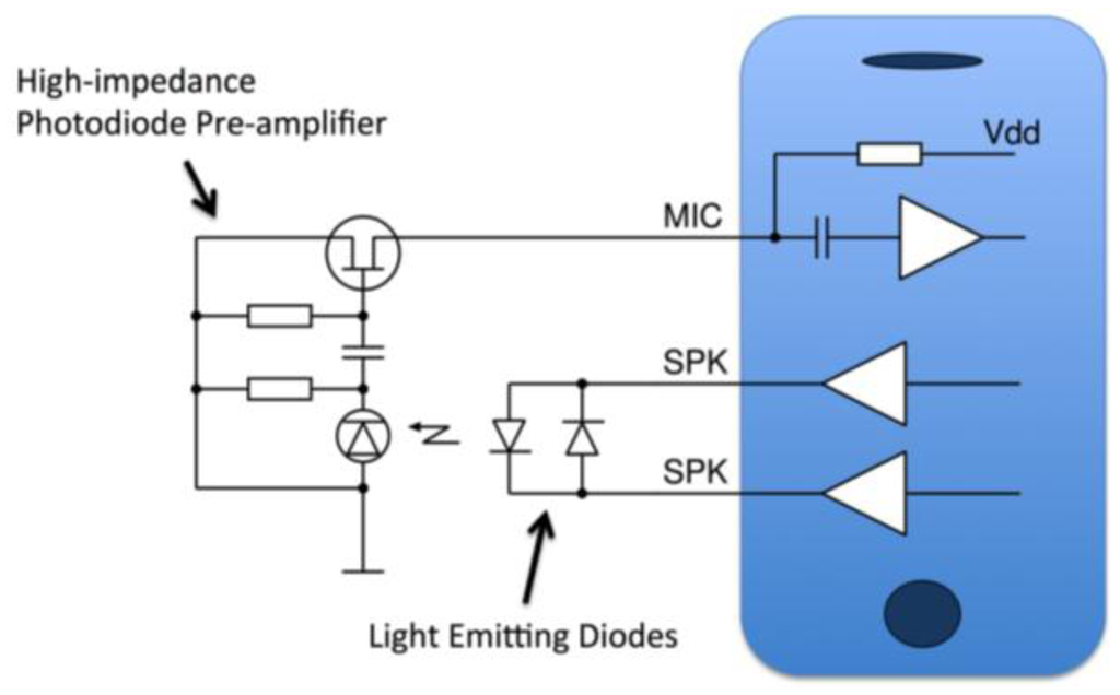 A conventional oximeter sensor contains two LEDs for actuation and a photodiode for detection (Figure 1). The audio interface of any phone or smartphone is well suited to drive such a sensor. The audio interface has a high-current output capable of driving the low impedance load of the LEDs and a high-gain input designed to interface to a high-impedance Junction-gate Field Effect Transistor (JFET) electret microphone pre-amplifier, equally suitable for amplifying the photodiode signal.