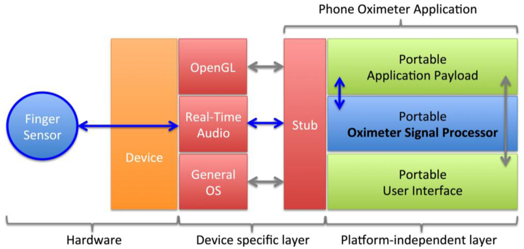 The application consists of a portable payload linked to a system-dependent stub that launches the application and is responsible for relaying system events to the payload (Figure 3). Data is transferred between the sensor and the application through the real-time audio layer of the smartphone to a portable signal-processing unit and OpenGL based user interface. The real-time audio layer was based on the AudioUnit framework on iOS-based devices and OpenSL on Android-based devices. These interfaces are commonly used for Voice Over IP (VOIP) applications requiring full-duplex real-time communication. The oximeter signal processing routines were written in portable C for maximum performance and portability between devices and architectures.