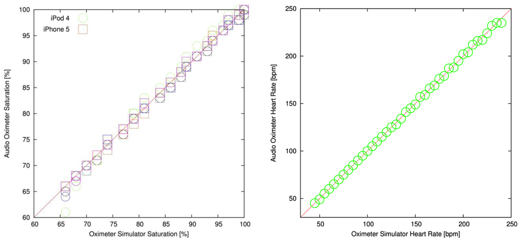 The oximeter application was evaluated with systematic tests for oxygen saturation and heart rate against the patient simulator (Figure 8, Table 1). The results show a strong correlation between heart rate and oxygen saturation values selected on the simulator. For oxygen saturation, the tests were repeated at optical transmission levels of 5, 10, 50, 100, 200 and 300 parts per million (ppm), which represents a large range of skin pigmentations. The same per-generation calibration lookup was used at all transmission levels on the two devices. The overall Pearson correlation coefficients for the oxygen saturation measurements were 0.9976 and 0.9992 for the iPod Touch 4 and the iPhone 5, both indicative of excellent correlation (a correlation of 1.0 representing an ideal straight line). The RMS accuracies of the oxygen saturation readings over all transmissions were 0.85% for the iPod Touch 4 and 0.45% for the iPhone 5 with a bias of 0.12% and 0.05%, respectively. Transmission levels or hardware revisions did not affect the heart rate algorithm, and the simulator was well correlated with the device (Pearson correlation coefficient was 0.9997).