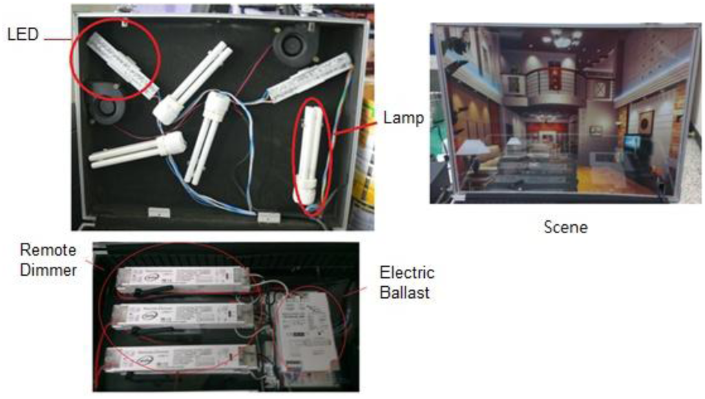 As pictured in Figure 11, a lighting control module is comprised of a remote light dimmer followed by an electric ballast and then by a set of energy saving light bulbs or LEDs. In this context, wireless remote control light sources are provided to meet the user's specific needs, including specified light brightness or light mode control, by a system server via a remote light dimmer. A scene is lit by the remote control light sources placed behind curtains.
