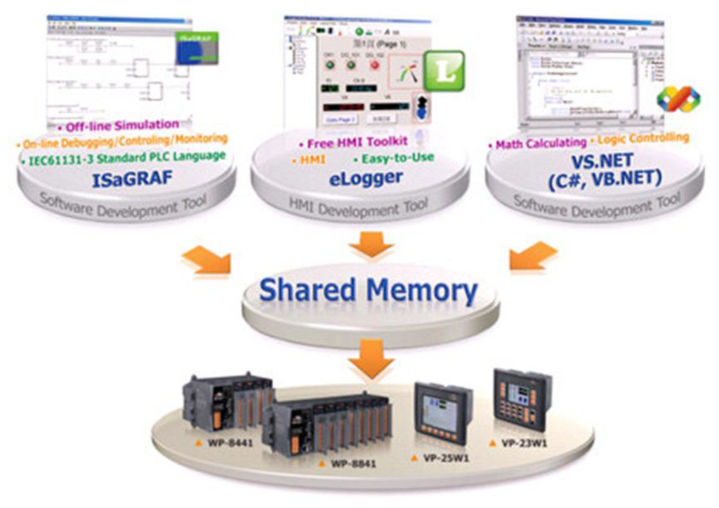 eLogger is a data collection tool to program the human computer interfaces for Windows CE. NET 5.0 based PACs (WinPAC, ViewPAC) and Windows CE .NET 6.0 based PACs (XP-8000 series), such that I/O monitoring and control systems can be constructed in a simple and highly efficient manner. Logic control feature is provided through the Shared Memory, according to which either ISaGRAF or VS.Net or works together with eLogger for the software development for logic controllers. Illustrated in Figure 15 is the way that I/O modules and other register data are controlled through the Shared Memory.