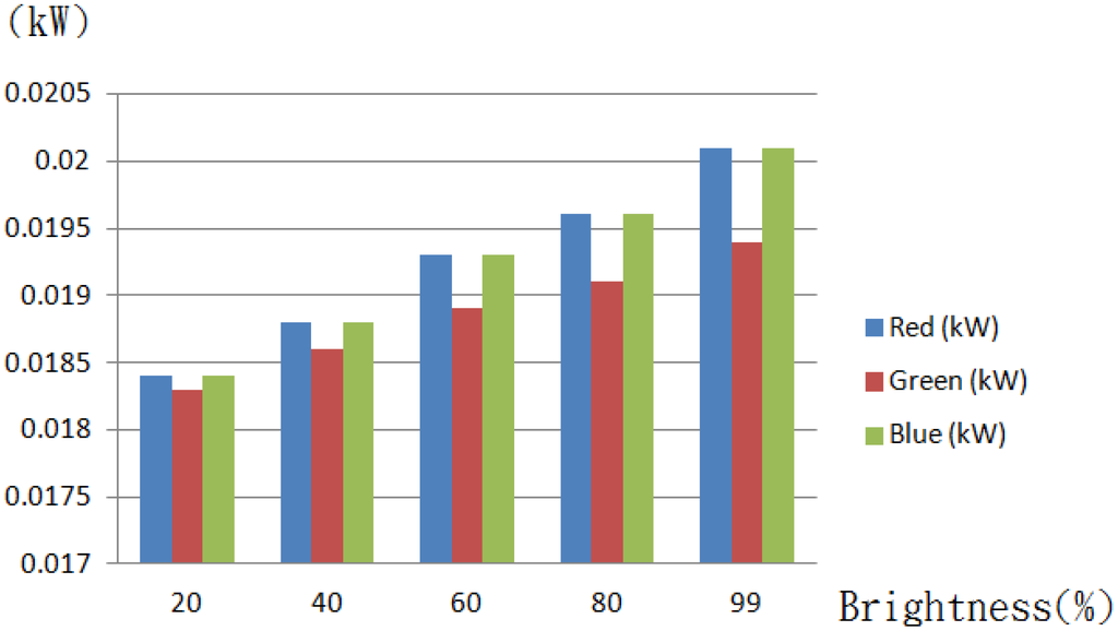 The brightness of a dimmable light tube is rated on a scale of 0 to 99. Demonstrated in Figure 20 are presentations of respective lighting modes, and in Figure 21 is a comparison result of the average power consumption versus brightness, and a high consistence is seen among the cases of a TV wall, a kitchen and a living room, due to the use of the same model light tubes.