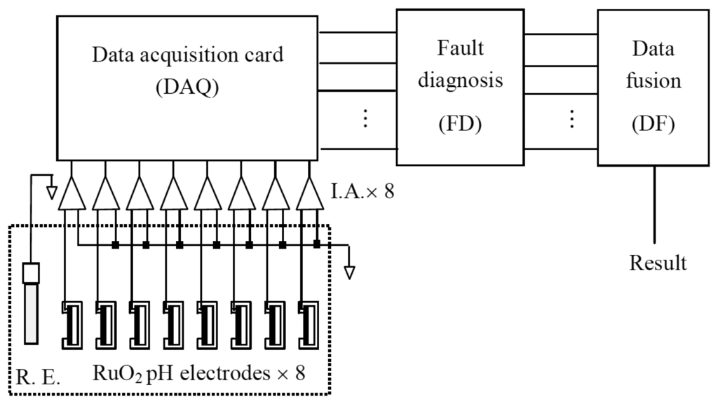 Fault diagnosis (FD) and data fusion (DF) technologies implemented in the LabVIEW program were used for a ruthenium dioxide pH sensor array. The purpose of the fault diagnosis and data fusion technologies is to increase the reliability of measured data. Data fusion is a very useful statistical method used for sensor arrays in many fields. Fault diagnosis is used to avoid sensor faults and to measure errors in the electrochemical measurement system, therefore, in this study, we use fault diagnosis to remove any faulty sensors in advance, and then proceed with data fusion in the sensor array. The average, self-adaptive and coefficient of variance data fusion methods are used in this study. The pH electrode is fabricated with ruthenium dioxide (RuO2) sensing membrane using a sputtering system to deposit it onto a silicon substrate, and eight RuO2 pH electrodes are fabricated to form a sensor array for this study.1. Introduction