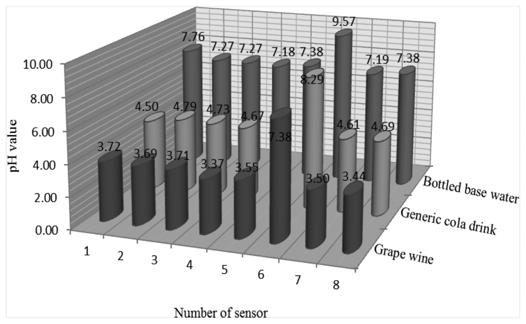 The sensitivity of sensor No. 6 is less than 50 mV/pH and lower than that of the others. In this study, we used the RuO2 based pH sensor array to repeat fifteen times measurements in grape wine, a generic cola drink and bottled water and to calculate the mean of the pH sensor measurements, which are shown in Figure 9. The pH values of sensor No. 6 in grape wine, generic cola and bottled water are higher than those of the other sensors. These measured data from sensor No. 6 are unusual.