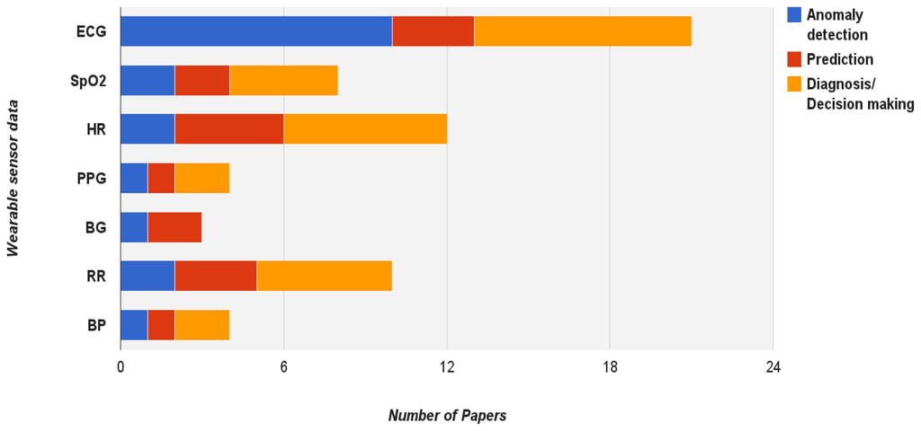 Figure 2 provides an outline of the three most used data mining tasks in relation to the vital signs that can be measured by wearable sensors considered in this review. ECG, which provides mostly the rich data, is predominantly used for all tasks in comparison to the other types of sensors. Equal emphasis is placed on anomaly detection and diagnosis and less attention put on prediction. In general, this applies to the majority of the vital sign parameters in the Figure. However, for health parameters such as heart rate and blood glucose, the percentage of the tasks dedicated to predication is higher. This is most likely due to the fact that these parameters are associated with monitoring of specific diseases e.g., diabetes whereby prediction is an important component [23]. This section further details the definition of each task depicted in Figures 1 and 2 and provides key related works for each task.