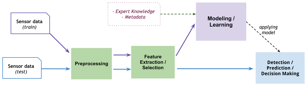 In the figure, the raw sensor data is typically used as a starting point of the data mining approach. Here, the sensor data is provided for both training data in order to learn the system, make a model of features, as well as testing data for real-world usage designed model and make the result. This data mining approach is suggested as a general flow for both supervised and unsupervised data mining solutions in order to provide any kind of data mining task as result. The main steps of the data mining approach consist (1) data preprocessing; (2) feature extraction and selection; and (3) modelling data learning the input features (considering expert knowledge and metadata) to perform the tasks such as detection, prediction, and decision making.