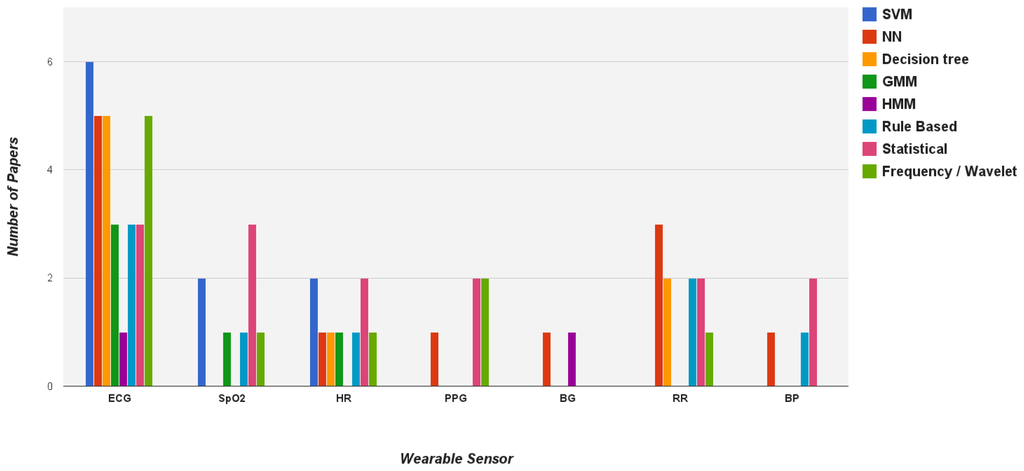 According to the survey, Figure 4 presents the application of data mining methods in relation to the health parameters gathered with wearable sensors is depicted. It can be seen that ECG, HR, SpO2 and RR are the most complex health parameters where researchers have applied several data mining techniques to analyze these vital signs. Considering the data mining methods, SVM, NN, decision tree and frequency/wavelet are commonly used methods for wearable sensor data processing though they have seen more often only on the ECG health parameter.