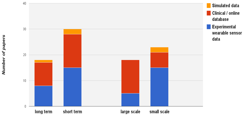 Scale (large/small): A big challenge of data analysis in any health monitoring system is the examination of the proposed method on more than an individual. Depending on the design of sensor network, data gathering, and the goal of decision making, the scale of subjects in the frameworks would differ. Here, the works considering a big number of subjects (patient or healthy) are counted as large scale studies [30]. The aim of these works is in addition to process the stream of data individually, they can handle the same data modelling for large scale of monitoring [31]. Due to the type of data mining tools, another group of papers focused on small scale of subjects (maybe one or at most 10 persons) in order to investigate the accuracy and correctness of results in proposed model [27,53].