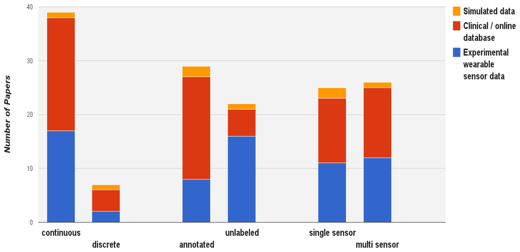 Figure 6 depicts the distribution of works on the other data properties. In a clinical setting and online databases, data is mostly characterized as continuous and labelled (as access to the experts and other health profiles is readily available). Wearable sensor data collected in other contexts are rather unlabeled. In this field relatively little data is discrete and is usually collected in conjunction with other sensor modalities.