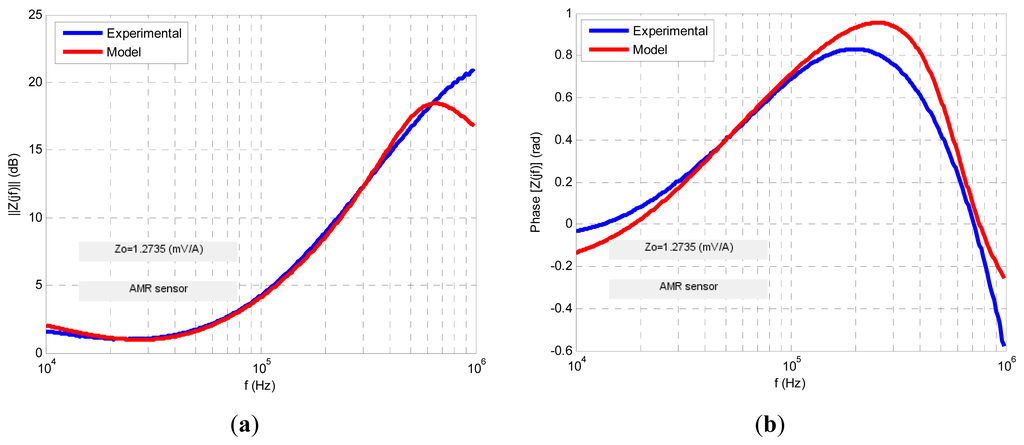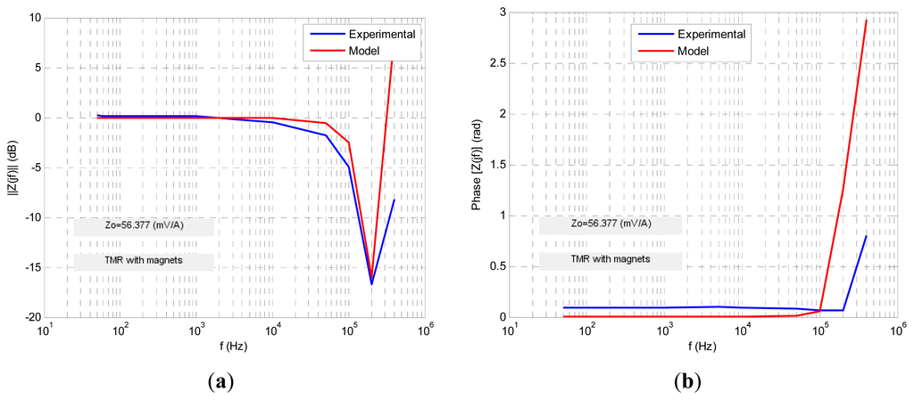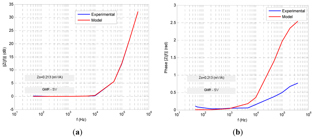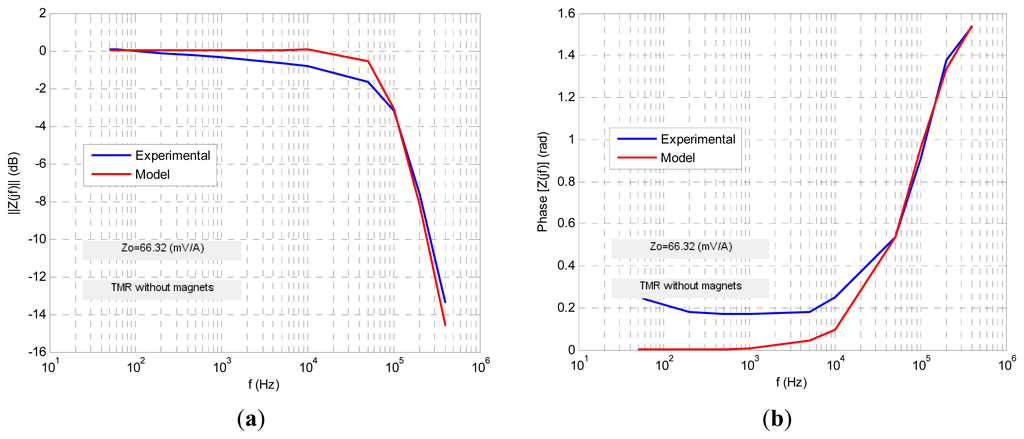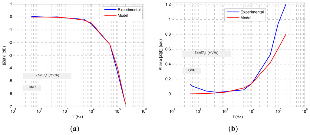 For each MR sensor the transimpedance Zt(jf) function in the frequency domain was obtained both in amplitude and phase formats (Bode diagrams) from the expressions: