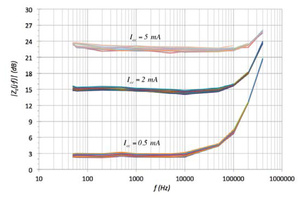 The AMR sensor responds to a more complex model with two zeros and two poles with their fractional index. The widest ac large-signal −3 dB frequency band are offered by the TMR technology (without and with magnets) providing at the same time higher zo dc sensitivity (Tables 3 and 4). These properties give the TMR technology an appropriate MR sensor to implement actual industrial applications. Moreover, it is possible to extend the practical frequency band applying the extension technique described in [39]. One effect observed in TMR-with magnet sensor was the variation of the bandwidth with the power supply bias current Icc. Figure 15 shows how the corner frequency of the transimpedance function is shifted to higher frequency region as the sensor constant current power supply increases. Nevertheless a trade-off must be reached between bandwidth and power consumptions in order to optimize the sensor use.