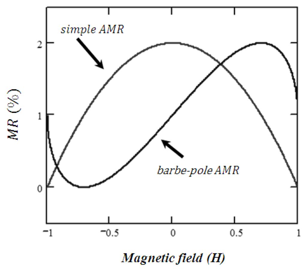 AMR technology is the simplest technology in terms of layers and materials. To be consistent with the following MR technologies, an AMR sensor comprises a single-permalloy layer of which magnetic moment is free to rotate due to an external-magnetic field influence Hf. The electrical resistance R is dependent on the angle between the magnetization of this free layer and its biasing current [29]. The R-Hf characteristic of a simple AMR sensor is shown in Figure 2. Note that each value of the resistance corresponds to two identical but opposed values of the normalized Hf. This non-linearity is corrected in Figure 2 using the barber-pole geometry [29], in which, the permalloy layer is coated with an Al wire orientated 45° respect to its longitudinal axis therefore creating a biasing field capable to set a linear-like sensor output curve around zero magnetic fields. AMR technology offers a weak MR effect, usually lower than 3%.