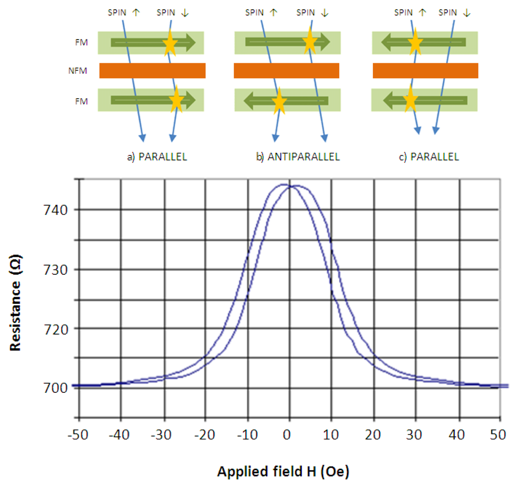 GMR technology offers sensors with a magnetoresistance variation in percentage terms ranging between 10%–200%. It consists of a multilayer structure where two ferromagnetic layers (FM) are separated by a nanometric non-ferromagnetic conductive layer (NFM). The electrical resistance depends on the scattering suffered by the electrons as a function of its spin (up or down) and the relative orientation of the magnetization between ferromagnetic layers. Its operating principle can be explained using the two-current model described in [30], which proposes that the current through a GMR structure is composed by two channels, one channel for spin-up electron and the other for spin-down electrons. If the orientation of the FM layers is antiparallel, then both channels provide high scattering for spin-up and spin-down electrons. But, in case the configuration of the FM layers is parallel there is a channel with low resistance for electrons either spin up or spin down electrons, depending on Hf direction. Figure 3 represents the R-Hf characteristic of a GMR sensor where it can be observed that again it is bi-valued in magnetic field because two values of it (equal in magnitude and opposite in sign) have assigned the same magnetoresistance value. This problem is solved by spin-valve technology (GMR-SV). It consists in a multilayer where one FM layer is free to rotate under an external magnetic field influence meanwhile the other layer is pinned orthogonally [31]. The GMR-SV effect is lower than GMR, but a change equal to 6%–20% is still greater than AMR technology.