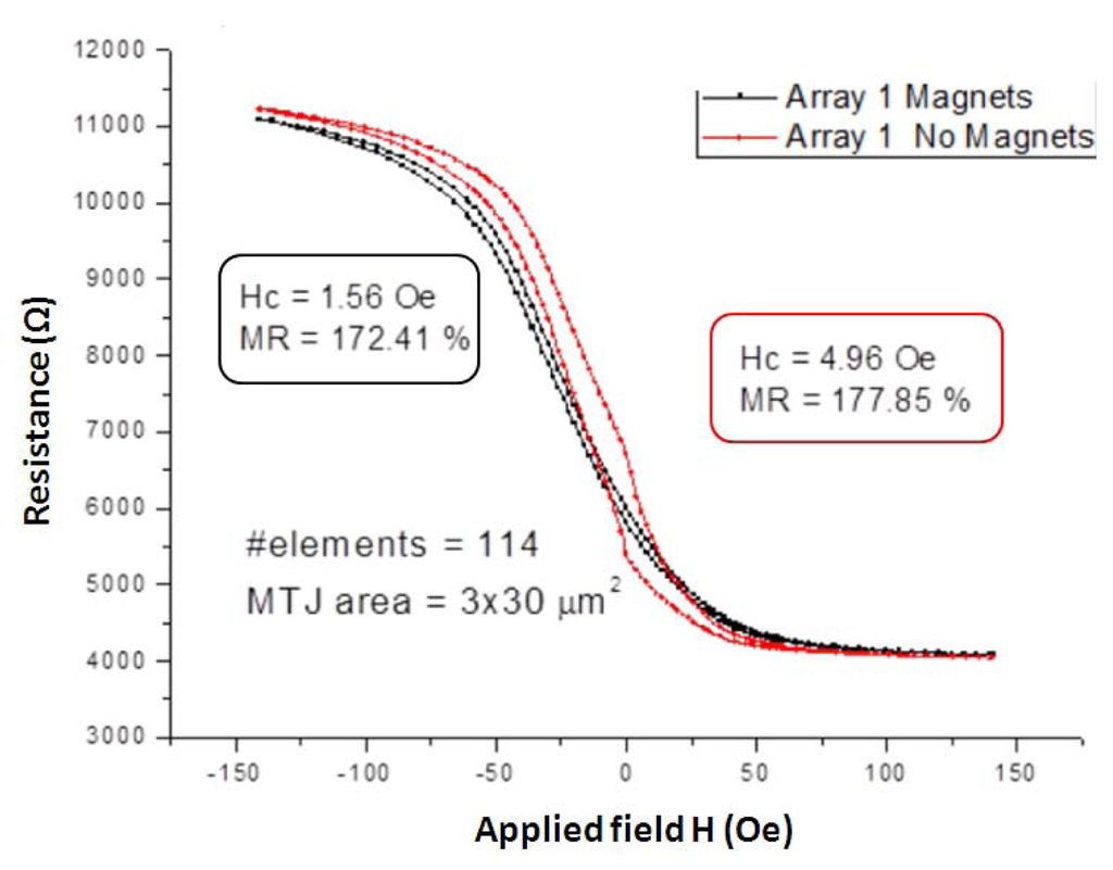 TMR technology provides the highest MR ratios (up to 500%) [34], its structure derives from GMR structures where the NFM conductive layer is replaced by an NFM insulating layer (MgO, Al2O3, for example). The electrons flow through the insulating layer by means of tunneling effect defined by quantum mechanics. They have strong likelihood to cross the insulating layer when the magnetization vectors of adjacent FM layers are in parallel alignment and low probability when they are in antiparallel alignment. These two states correspond respectively to low and high electrical resistance state. Although the variation of resistance is due to different physical principles, GMR and TMR structures exhibit a similar R-Hf characteristic curve, and are based on the same principles as the spin valve technology to obtain a linear response. TMR main drawback is the presence of hysteresis in its R-Hf characteristic, however this can be minimized using integrated permanent magnets [35]. Figure 5 shows the R-Hf characteristics corresponding to two TMR sensors one with and the second without biasing magnets. These characteristics belong to a MTJ stack based in MgO that was deposited at the International Iberian Nanotechnology Laboratory (INL, Braga, Portugal) in the Timaris sputtering system, with a layer structure of: Si/2000 SiO2/50 Ta/500 CuN/50 Ta/500 CuN/50 Ta/50 Ru/75 IrMn/20 CoFe/8.5 Ru/26 CoFeB/10 MgO/30 CoFeB/2.1 Ta/160 NiFe/100 Ta/300 CuN/70 Ru/150 TiW(N) (thickness Å). The permanent magnets were then implemented with CoCrPt thin film elements, [36], patterned after the sensor microfabrication.
