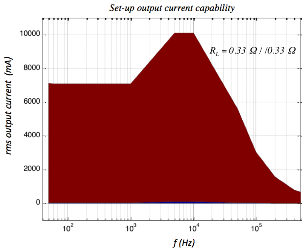 In all the cases a frequency sweep was selected for a sensor sine wave input current using a high level rms large signal value in amplitude. Figure 7 shows the experimental set-up used to obtain the ac transimpedance frequency response. All the current sensors were energized by a 2 mA constant current source (mod. 6221, Keithley, Cleveland, OH, USA) and the current to be measured by them was generated by two voltage-controlled amplifiers. From a practical point of view it was difficult to have a unique equipment generating in good conditions and simultaneously the current amplitude and frequency needed by the test requirements. Consequently, the whole test was divided in two: the low and the high frequency tests. The low-frequency test was done using a transconductance amplifier (3200 PCS-2B, Krohn-Hite, Brockton, MA, USA) because it has a low cut-off frequency response. In the case of PCS-2B model a peak current amplitude of 10 A was guaranteed between the 40 Hz–1 kHz band. On the other hand, the high frequency test required an equipment prepared to reach the highest possible upper frequency response. In this work the sensing current was generated by a high-frequency transformer with a 21:1.1 turns ratio [38] connecting in its primary side a wide band voltage amplifier (Krohn Hite 7500) with a dc-to-1 MHz frequency response. The ac test was carried out up to a 400 kHz frequency because this limit was imposed by the transformer frequency response limitations. Figure 8 shows the output current capability of the high frequency test (wide band voltage amplifier and voltage transformer loaded with 0.165 Ω). This equipment is able to generate rms current levels of 10 A in a reduced frequency interval (5–10 kHz) but it is capable to reach easily 0.8 Arms at 400 kHz. In both tests the reference dc voltage signal was generated by a waveform generator (Agilent 33120A). The sensor output voltage is a differential signal and in all the cases was measured by an oscilloscope (TDS3034, Tektronix, Beaverton, OR, USA) using two identical and compensated 1:1 voltage probes using the difference mode of the oscilloscope. A differential voltage probe was not used in the test because this would cause additional gain errors and phase shifts. The current measurement was done by the Tektronix TCP202 current probe and the sensor transimpedance Zt(jf) function was obtained taking readings of the rms input current and output sensor voltage and the phase shift between both signals (Figure 9). The sensors studied were submitted to input rms current values between 100 mA and 3.6 A for frequencies of 50 Hz, 60 Hz, 200 Hz, 500 Hz, 1 kHz, 5 kHz, 10 kHz, 50 kHz, 100 kHz and 200 kHz and with 0.8 Arms for 400 kHz frequency.