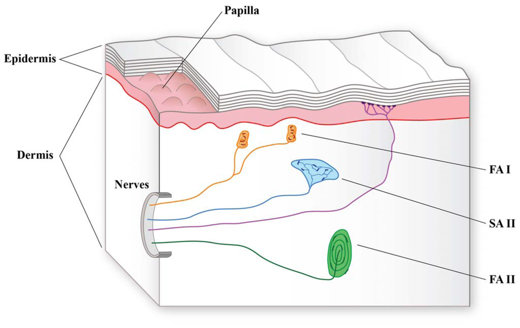 FA I receptors are represented by Meissner's corpuscles, innervating the skin even more densely (about 140 units/cm2) than SA I units; they are responsible of low-frequency vibration, flutter, slip and motion detection [22,24].
