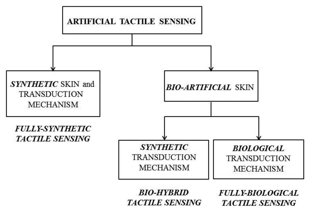 In order to obtain an artificial tactile sensory system, an outer interface layer with distributed and embedded tactile sensors should be developed. To this aim, in this review paper, the achievement of an artificial sense of touch has been analysed with respect to possible approaches to fabricate the system (Table 5): synthetic approaches (e.g., piezoelectric, piezoresistive, strain gauge, capacitive, inductive and optoelectric sensors) versus bio-artificial ones (here classified as bio-hybrid and fully-biological).