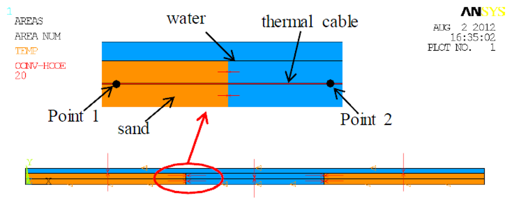 For the transient analysis, a 4-node, 2D thermal element PLANE55 was employed in modeling the system. Because of the complicated hydrodynamic and geomorphic conditions, it is challenging to accurately obtain all of the thermal parameters of the surrounding medium along the pipeline. The measurement of thermal parameters is beyond the scope of this study, at least for the moment. Therefore, empirical parameters for thermal properties were used in this study. Material parameters for water, sand and copper are listed in Table 1. Of particular note are sand and copper. Sand was the sediment in this study and copper was the main component of the thermal cable. Thus, sand and copper were used to represent sediment and thermal cable, respectively.