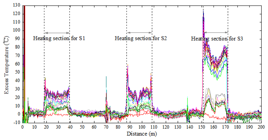 For the sake of saving computer storage, only the first 200 m of the fiber circuit was scanned. As can be seen from Figure 10, after heating for some time, the heated sections were noticeable, with each section being roughly 21 m in length. Each curve represents the sampling data of one scan and the excess temperature can be obtained by subtracting the corresponding values before heating. The working section for each sensor was approximately 18 m, Sensor 1 was located from 20.35 m to 37.44 m, Sensor 2 from 88.31 m to 106.62 m, and Sensor 3 from 153.01 m to 171.33 m.