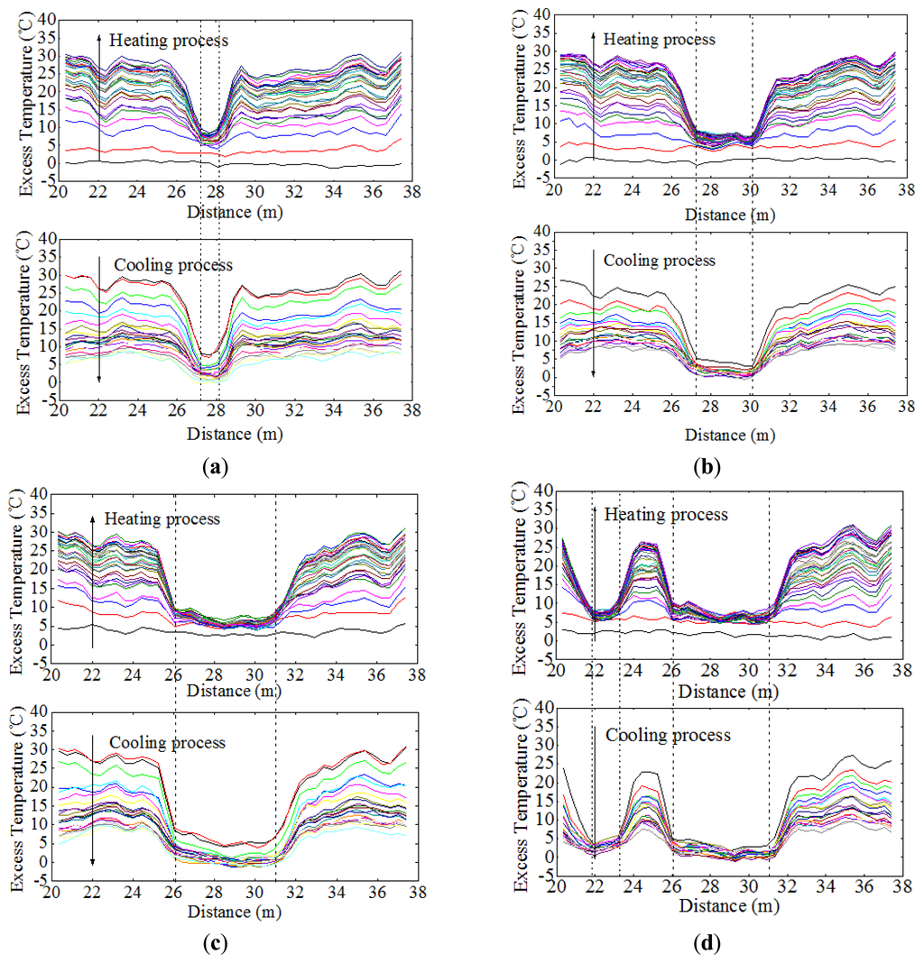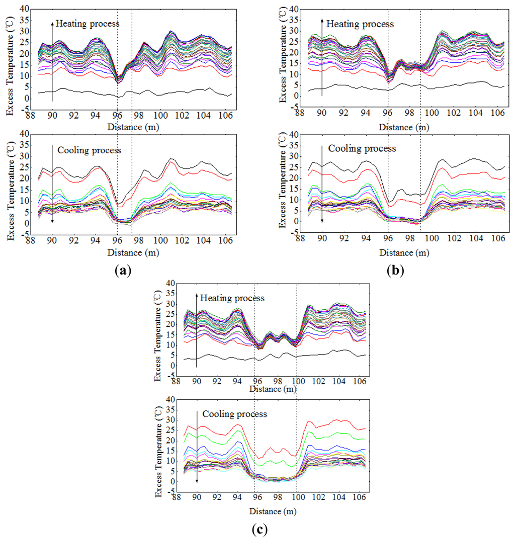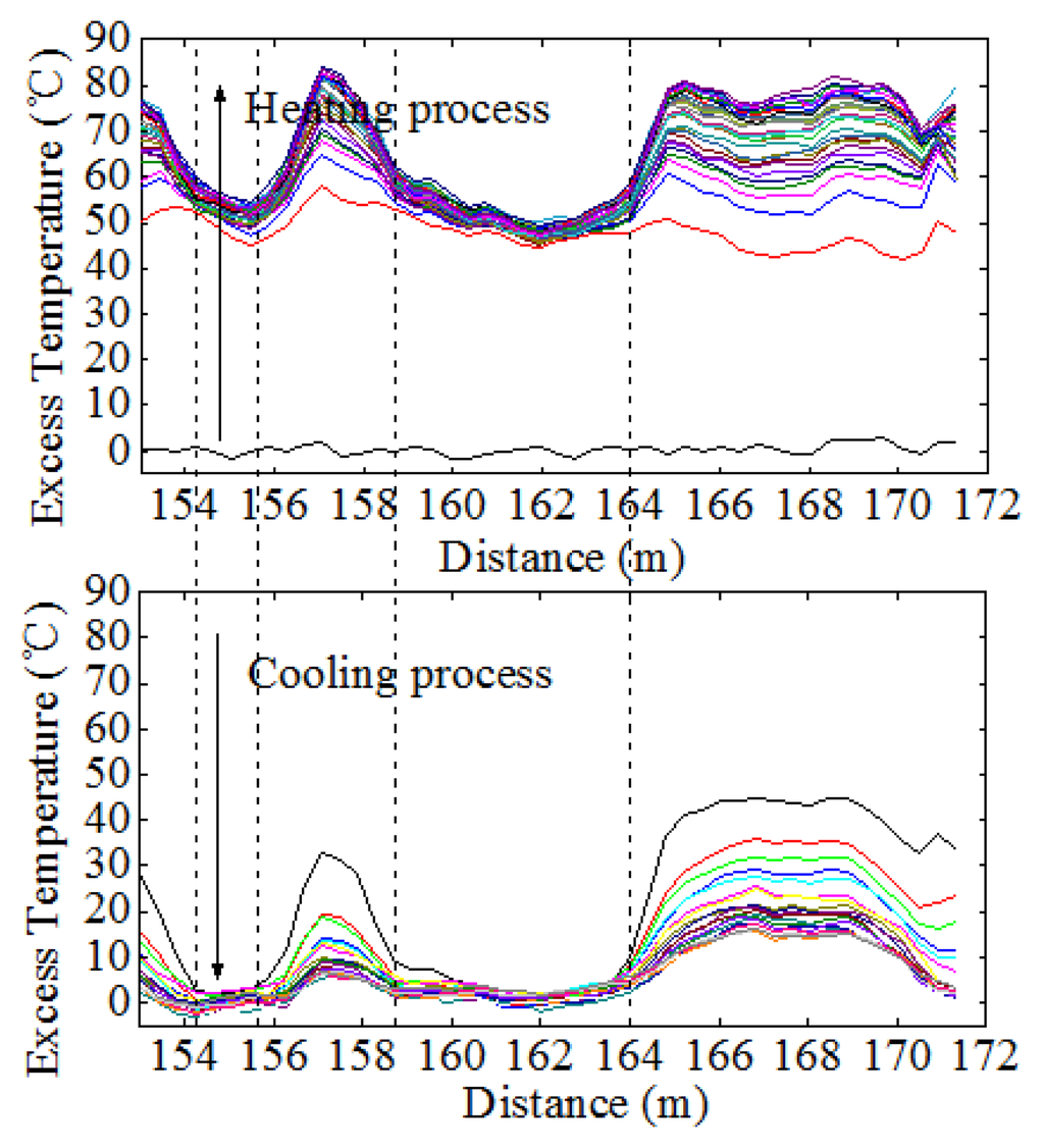 In this case, it is hard to determine the exposure length simply by analyzing the data from the heating process, but the data can serve as a good reference. By combining the data from the heating process with the cooling process, a convincing result can be obtained. In practice, there are a number of departures from the ideal situation. For example, the formation of air gaps within the thermal cable and the uneven sediment compactness will affect the uniformity of the excess temperature curves, making the detection of exposure length difficult.
