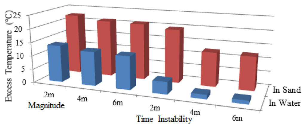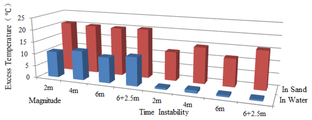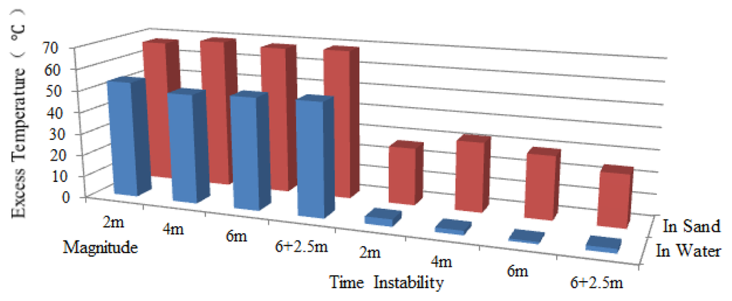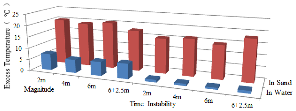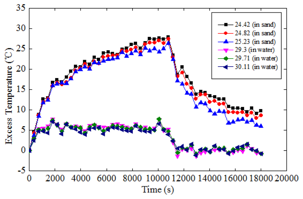 Figure 17 shows the excess temperature curves obtained from Sensor 3 under two free span conditions. The overall excess temperature in heating process was much higher from Sensor 1 and Sensor 2 due to the higher power input of the constant-temperature heating belt and its unique heating mechanism. Higher excess temperature does not seem to provide higher resolution compared to the constant-power heating belt. After heating for 3 hours, the highest temperature within Sensor 1 and Sensor 3 were 31 °C and 84 °C. However, temperature gap between in-sand and in-water scenarios showed no significant difference as the gap for Sensor 1 was approximately 20 °C and the gap for Sensor 3 was 25 °C. The constant-temperature heating belt was powered by a direct alternating current. The active operating time and maximum length of the belt are limited. However, as the power was supplied by the explosion-proof temperature controller, the constant-power heating belt can work continuously with low energy consumption. Furthermore, the heating belt can be combined to synthesize several kilometers in a strand. In practice, for the constant-power heating belt is preferable for its controllable surface temperature and lower working power input in long distance subsea pipeline scour monitoring.