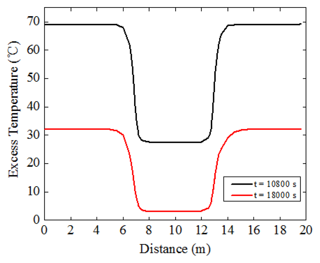 Figure 3 shows the variation of excess temperature with distance along the thermal cable, at t = 10,800 s and t = 18,000 s. It can be clearly seen that, for both cases, temperature in the sand was higher than that in water while remaining constant in general. However, near the interfaces between sand and water, the temperature varied sufficiently enough to distinguish the interfaces. In sand, the overall temperature was higher, while in water, it was lower. The temperature gap can be used to identify the free span length. The actual free span length is 6 m, from 7 m to 13 m, as shown in Figure 1. In Figure 3, it is evident that the first interface between sand and water was between 6 m and 8 m along the thermal cable, and the second interface was between 12 m and 14 m. To be prudent, it can be said that the predicted free span in this case was between 6 m and 14 m, containing the actual free spans ranging from 7 m to 13 m. Note that there exists one meter deviation by taking safety into account in the numerical study, but considering the actual pipeline can be hundreds of kilometers in length, this level of deviation is negligible.