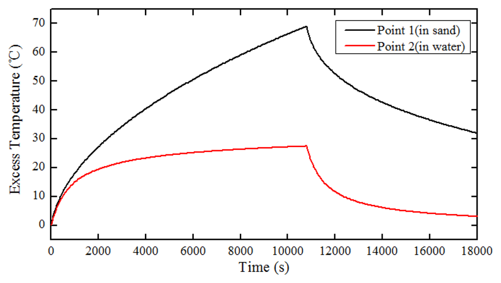 To further investigate the heat transfer behaviors of the scour monitoring system, two points were taken from the FE model as a demonstration. One point, marked Point 1, is located in the sand along the thermal cable; the other, marked Point 2, is located in water along the thermal cable as shown in Figure 1. Variation of excess temperature with time for Point 1 and Point 2 is shown in Figure 4. As can be seen, during the first 500 s, the excess temperatures for both Point 1 and Point 2 rapidly increased concurrently, overlapping in general. After that, the value of excess temperature for Point 1 increased gradually in the heating process. However, the value of temperature for Point 2 began to level off and experienced little change until cooling. Consequently, the temperature gap between Points 1 and 2 increased during the heating process, making them distinguishable. In the cooling process, the temperature curves for both Point 1 and Point 2 decreased exponentially. The value of temperature for Point 2 swiftly decreased and approaches the initial room temperature assymptotically. According to Equations (3) and (5), excess temperatures both in the sand and in the water will rise quickly during heating process. Subsequently, the temperature in the water will begin to stabilize and while the temperature in the sand will continue to rise at a decaying rate. The temperature in the sand exceeds those in water just in several minutes and enlarges the temperature gap slowly. In the cooling process, excess temperature in water decline exponentially and finally return to zero while those in sand decrease at a quickly decaying rate. Therefore, the temperature is higher in sand than that in water. Based upon the characteristics described above, the in-water and in-sand scenarios can be identified, the interfaces between in-water and in-sand scenarios are recognizable, and then the free span is detected.
