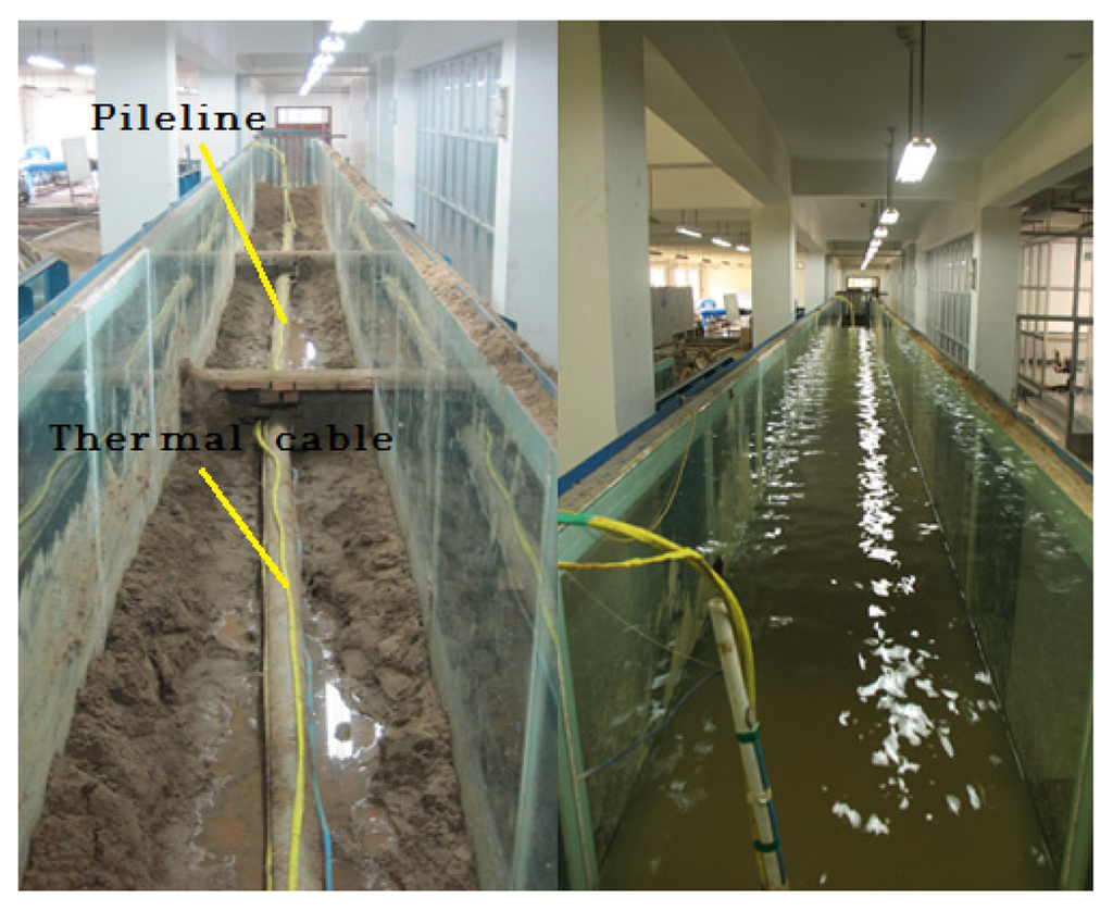 In an earlier study [], the feasibility of the proposed method was examined. However, the heat transfer behaviors for a linear heat source in water and sediment have not been fully understood. It may hard to understand the development of the scour condition of the pipeline by just installing one thermal cable in the pipeline. Moreover, when it comes to field applications, it will face problems such as the power consumption of the constant-temperature heating belt and length limitation of the heating belt. Further investigations are presented in this study.