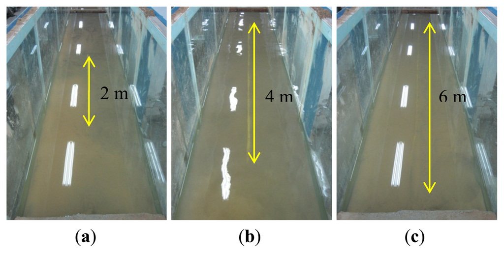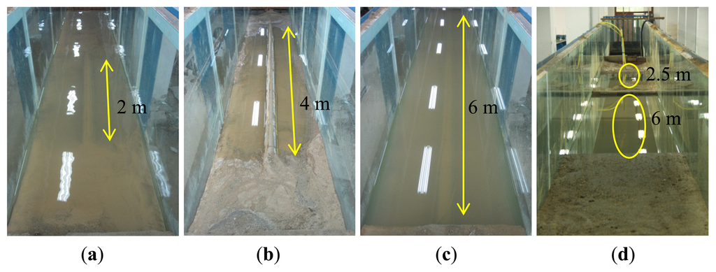 The experiments were divided into two parts. To simulate the early stage of subsea pipeline scour, the first experiment involved exposing the upper surface of the pipelines to water by taking into account the variation of the exposure length, including 2 m, 4 m and 6 m, as shown in Figure 8. The exposure conditions were then detected by the optical fiber sensors on the upper surface of the pipeline. The second experiment was conducted afterwards, which was to simulate the scour-induced free span of subsea pipeline by digging out the sediment. Likewise, the free span length was varied, including 2 m, 4 m and 6 m (Figure 9), and the free span conditions were detected by all the three optical fiber sensors. In addition, two free spans (2.5 m and 6 m) were also created to test the scour monitoring system, as shown in Figure 9. The measurements were repeated three times.