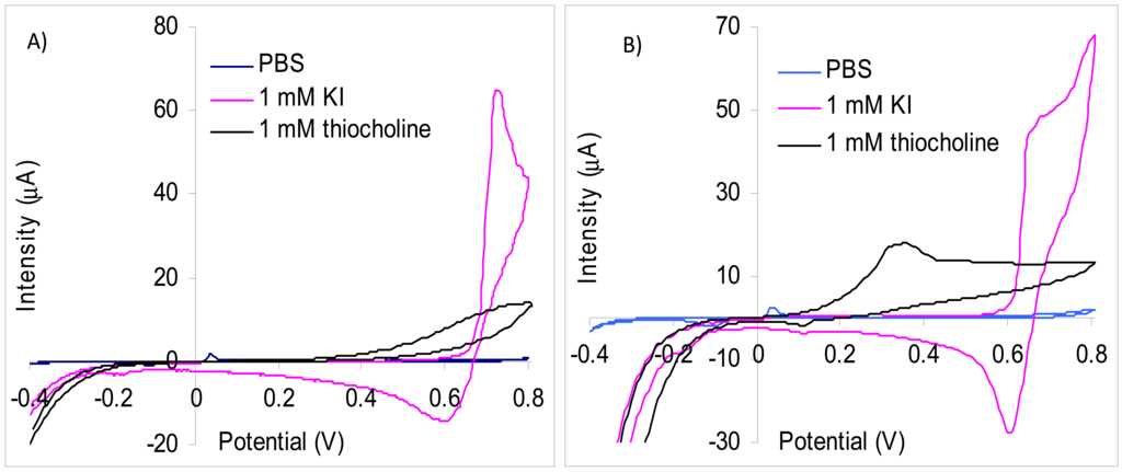 The cyclic voltammetry (CV) and amperometric measurements were performed with a galvanostat/potentiostat Autolab PGSTAT302N (Metrohm-Autolab, Utrecht, The Netherlands) controlled by a PC with the software Nova 1.8. In amperometry, the electromagnetic noise produced by magnetic stirring was reduced using the filter from the ECD module set to 1 s. The CV were made between −0.4 and 0.8 V at a scan rate of 100 mV/s in PBS. Amperometric measurements were performed at different potentials (depending on the WE material) in magnetically stirred solutions with successive injections of thiocholine or potassium iodide.