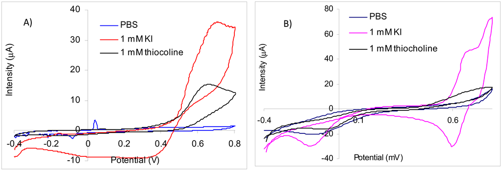 In the literature the difficulty of using the carbon based electrodes in combination with iodide containing enzymatic substrate was observed. Different strategies were used to address this problem like covering the WE surface with a Nafion layer that decreases the oxidation overpotential of the thiol moiety to 400 mV [11] or the use of WE made from epoxy-carbon composites covered with a cellulose nitrate enzymatic membrane to separate of the oxidation of thiocholine and iodide so that the current measured at 610 mV is mainly due only to the thiocholine [12]. Two reversible peaks were recorded by CV using WE made from spectrally pure graphite: one a lower potential one that was attributed to iodide and the second due to thiocholine at a potential that it is pH dependent [13]. The authors were able to obtain inhibition percentage by amperometric measurements at 800 mV (the higher potential), but were unable to observe a total inhibition of the enzyme because, besides the enzymatically produced thiocholine, they measured also the parasite signal of the iodide oxidation [14]. Other papers describing cholinesterase based biosensors that use iodide containing substrate without investigating the effect of iodide: home-made screen-printed electrodes using amperometric detection at +600 mV [15] or a glassy carbon modified with oxidized exfoliated graphite nanoplatelet (xGnPs) dispersed in chitosan with signal quantification by CV (peak at 950 mV) [16]. It is interesting to mention that iodide is not only an interfering substance that is simultaneously oxidized with thiocholine, but it acts also as a mediator for the oxidation of thiocholine [17]. This catalytic effect amplifies the difficulty of biosensor signal attribution and increases the measurement errors.