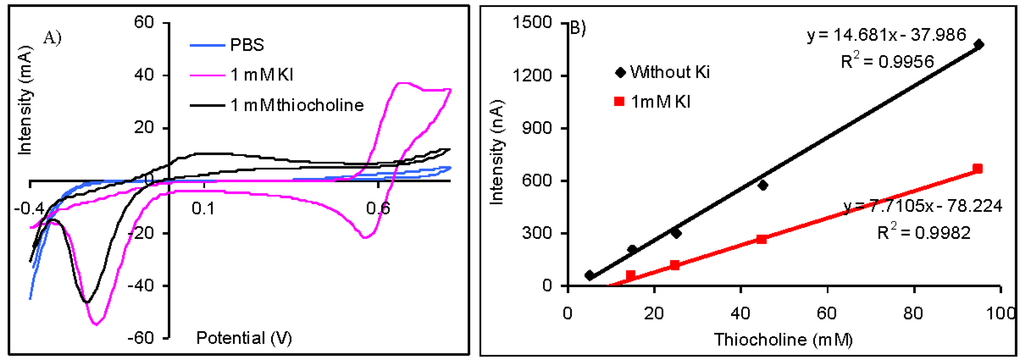 Different potentials were reported in literature for the quantification of the analytical signals of biosensors developed by the immobilization of AChE on electrodes modified with cobalt phthalocyanine when acetylthiocholine iodide was used as substrate. A wide oxidation peak attributed by the authors to the overlap of the peaks of unknown species was obtained by differential pulse voltammetry recorded from 100 to 1,000 mV. An oxidation peak attributed to the thiocholine with maximum at 370 mV with a height approximately equal with one third of the previous wide peak was obtained when the differential pulse voltammetry was carried out in a narrower potential range between 100 and 500 mV. The optimum potential for amperometric measurements chosen by authors was 370 mV, but the enzymatic inhibition may be determined between 300 and 400 mV [24]. The thiocholine was measured without interferences from iodide at a lower potential of only 100 mV that was chosen by hydrodynamic cyclic voltammetry, but authors caution on the important differences between their results and the ones obtained by other teams that may be due to variation in electrode material and possible electrode conditioning [25].