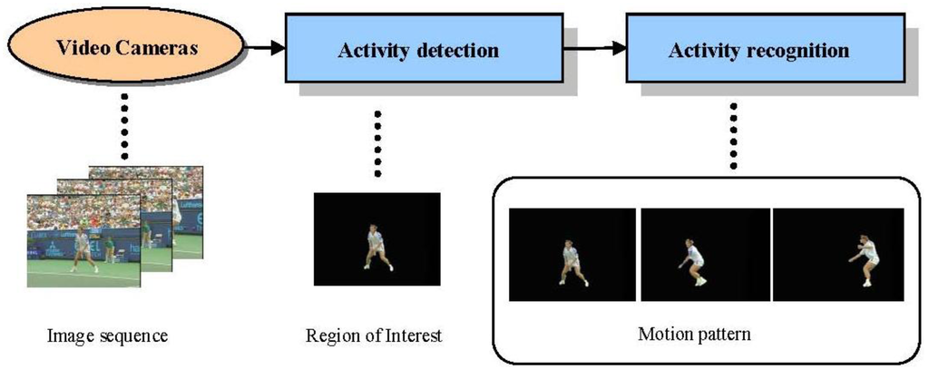 As described in [2], activity recognition aims to draw a description of human actions and interactions through the analysis and understanding of human motion patterns. It contains two level procedures [3]. As illustrated in Figure 1, the lower level aims to detect the regions of interest (ROIs) corresponding to static or moving humans; while the higher level recognizes temporal motion patterns of human activities. From a technical viewpoint, human activity recognition can be considered as a classification problem using time varying feature data. Visual information is extracted from video sequences and represented in relevant features, which are used to match with the features extracted from a group of labeled reference sequences representing typical activities. During the extraction procedure, three kinds of features may be involved: single object's features (i.e., position, velocity, veins, shape, color and etc.), global features of multiple objects (i.e., average speed, region occupancy, relative positional variations and etc.), and the relationships between objects and background [4].