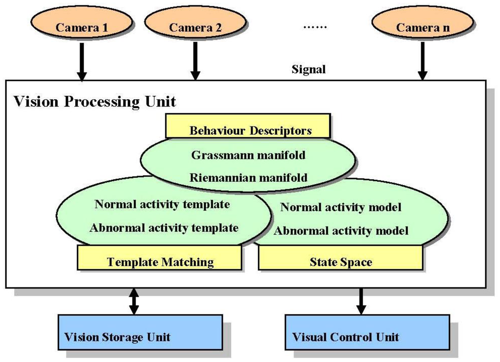 Vision based surveillance systems can be used to detect, analyze, and recognize activities. In [32–34], good descriptions of vision processing techniques in surveillance systems were presented. As illustrated in Figure 2, the basic framework of an automatic vision surveillance system is composed of a set of cameras, vision processing unit, vision storage unit, and visual control unit. These units were interconnected through a network or other kind of device. In the framework, vision processing unit plays an important role, which contains the key techniques for activity recognition.