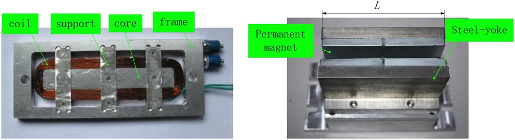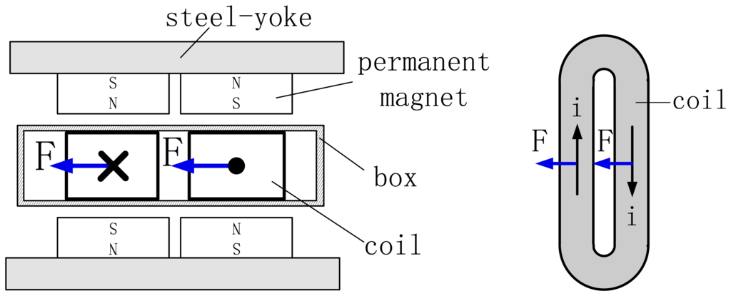 The working principle of a Lorentz motor is that a Lorentz force will be exerted on the coil when an electric current flows across it. Electric current I and MFD B are perpendicular to each other, and the direction of the Lorentz force F will be decided by Fleming's left-hand rule. The layout of the LM is illustrated in Figure 2. In order to make the Lorentz force uniform on both sides of the coil, the PMs are stuck on the steel-yoke with alternating polarities. The coil is laid in the air-gap between two opposite magnet poles.