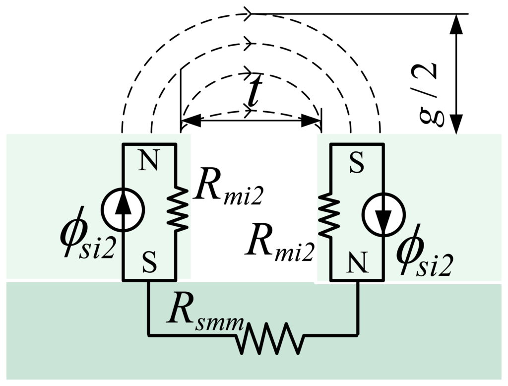 By definition, ϕsi1 and ϕsi2 are the flux-leakage sources of the magnet pole in gap t and air-gap g, respectively. ϕsi3 is the flux source of the magnet pole; Rmi1, Rmi2 and Rmi3 are the reluctances corresponding to fluxes ϕsi1, ϕsi2 and ϕsi3, respectively. Rmn and Rmm represent the different reluctances due to magnet pole-to-pole leakage. Rsmn, Rsmm and Rs denote the reluctances of the steel-yoke in different MECs.