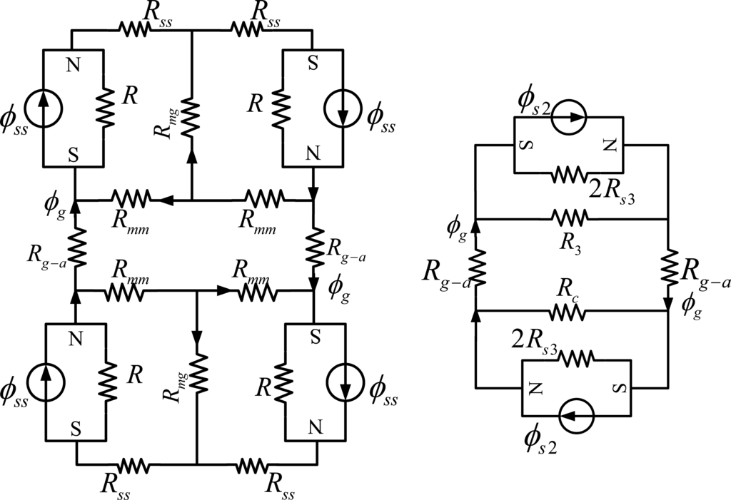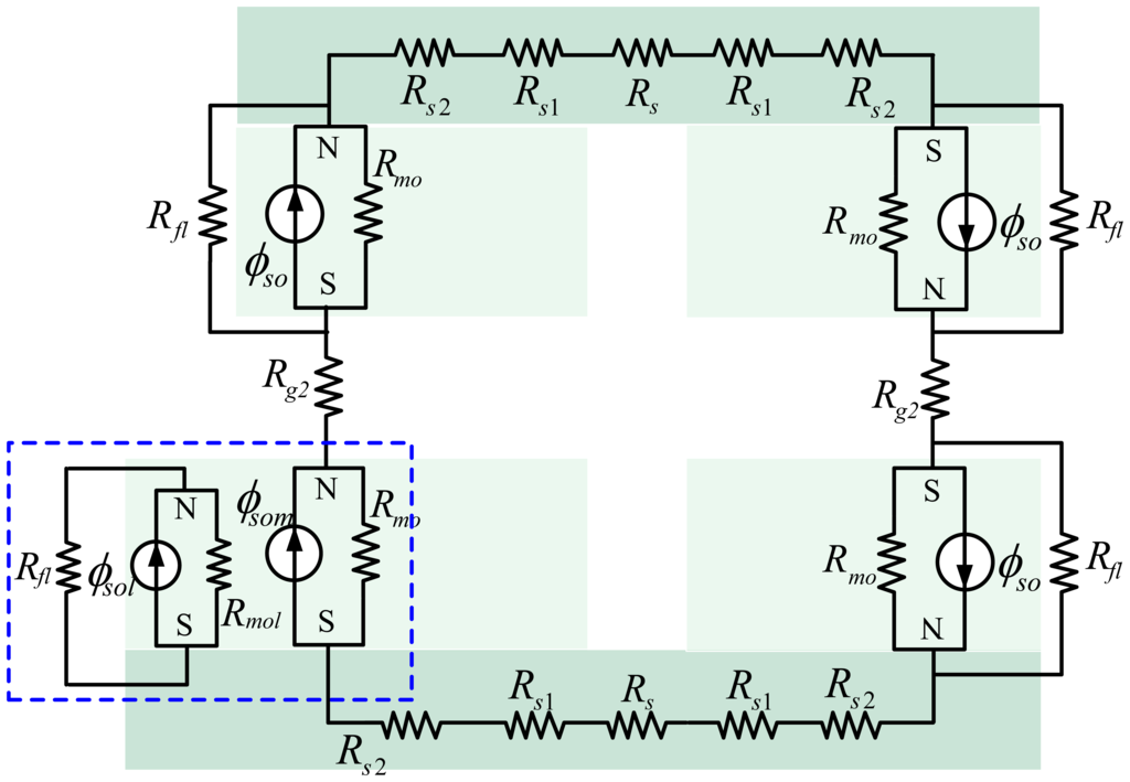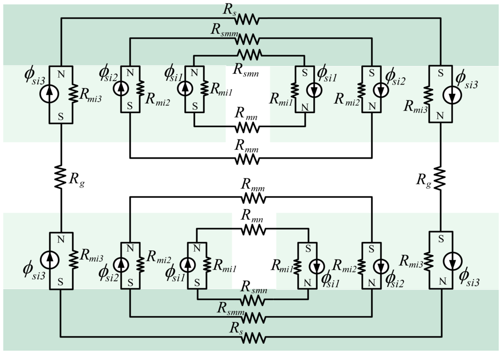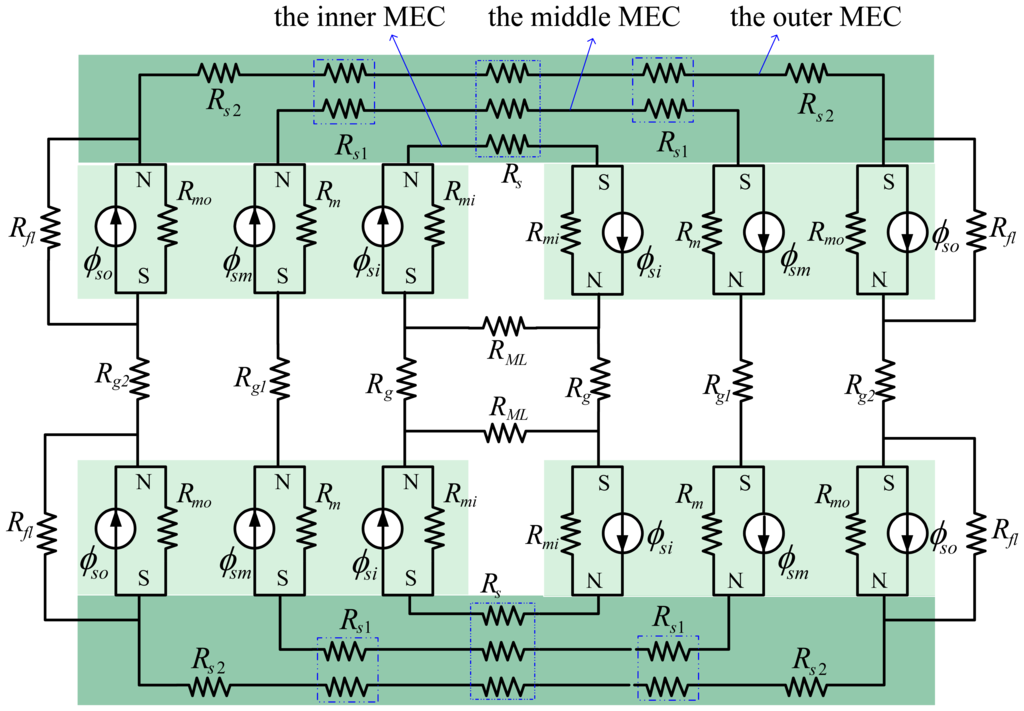 In Figure 6, ϕsi, ϕsm and ϕso are the flux sources of the magnet pole in the three sub-MECs, respectively; Rmi, Rm and Rmo stand for the reluctances corresponding to the fluxes ϕsi, ϕsm and ϕso respectively. Rg, Rgl and Rg2 represent the air-gap reluctances in the three sub-MECs. Rs, Rs1 and Rs2 denote the different reluctances in the steel-yoke. Rflis the leakage reluctance of the outer MEC and RML is the leakage reluctance of the inner MEC.