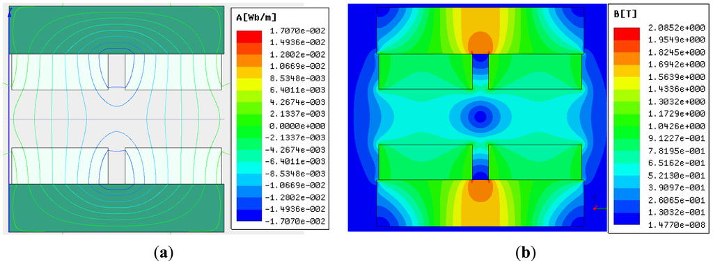 Figure 13 shows the flux contour profile and MFD distribution of the air-gap in the LM. Figure 13(b) shows the MFD of the air-gap in the LM. The MFD of point A (as shown in Figure 3) is 0. In the location of the middle sub-MEC, MFLs are nearly ideal.