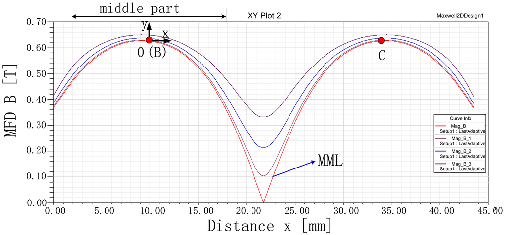 Variation of the group of lines with coordinate x is plotted in Figure 14. The curves indicate that the MFD in the middle part of these lines changes less than 0.1 T. The Lorentz force is exerted on the coil placed in this part. Thus, it is critical to analyze the MFD in this middle part. From Figure 14, it can be seen that all the curves have the same qualitative trend.