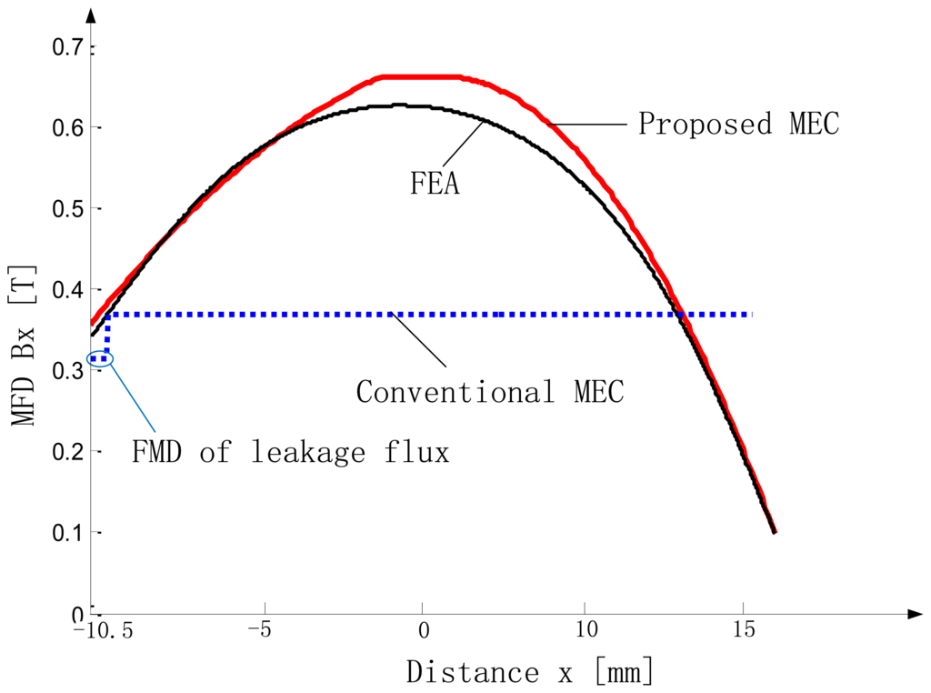 The MFD on MML is depicted in Figure 14. Since the curve is symmetric, it is enough to study half of it. In Figure 15, the curves, obtained from the proposed SMEC (Equations (5)–(7) and (9)–(11)), 2-D FEA and conventional MEC, are shown for comparison.